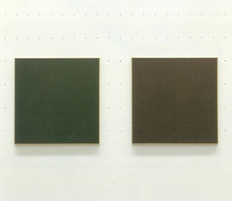 しかし眼を凝らして一枚一枚見ていくと、その画面は連続する無数の六角形で埋め尽くされている。その六角形の一辺はほぼ1.0〜1.5cm前後の長さを保ちながら、幅の大小により微妙なずれを画面に生じさせている。さらに面相筆の緻密な筆づかいによる抑えた色相や明度、彩度のグラディエーションの流れが色面の拡がりと奥行きを感じさせる。
